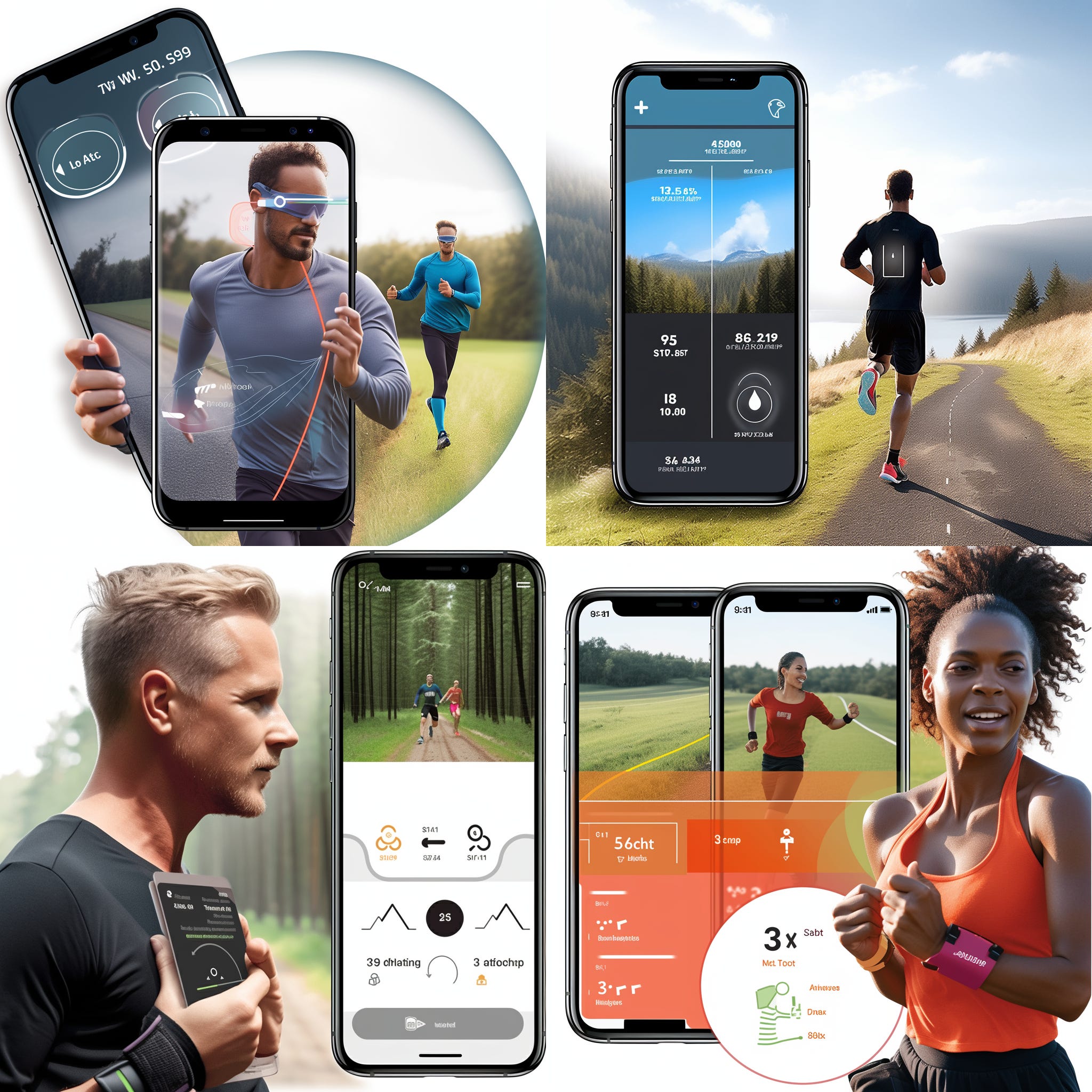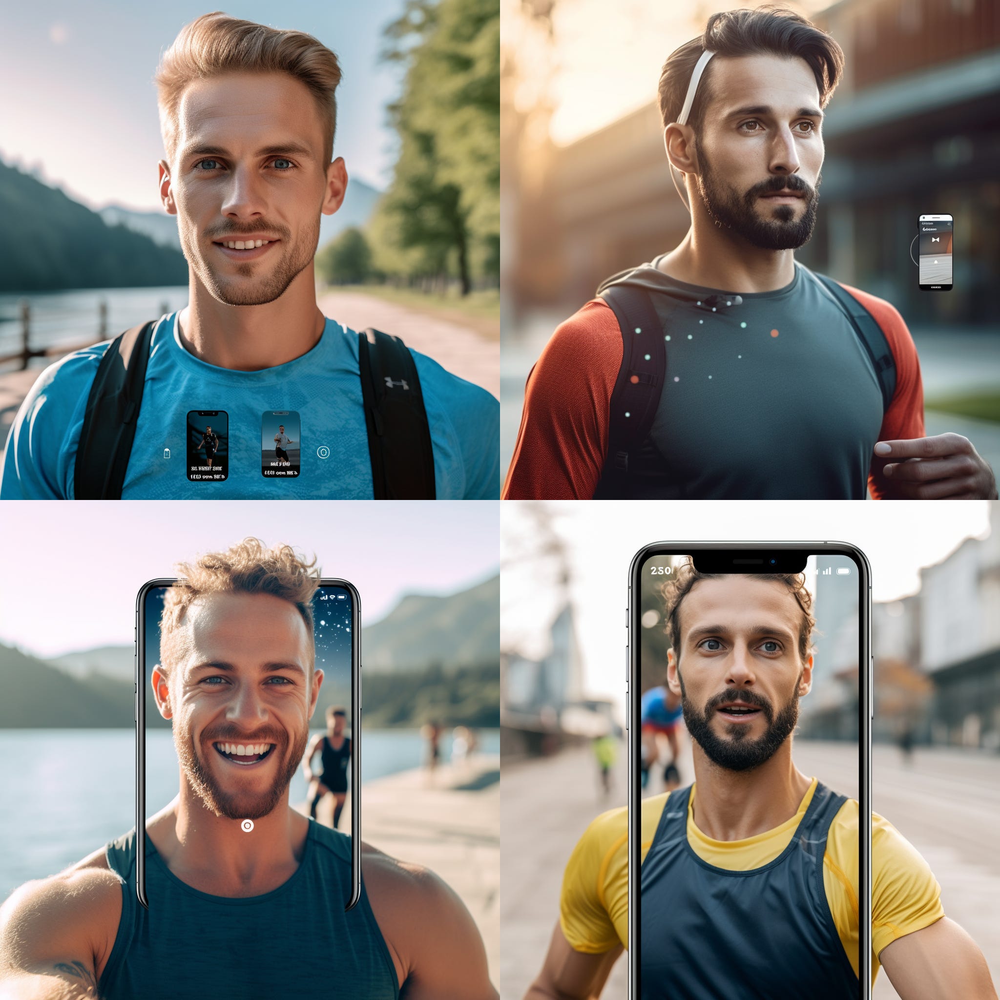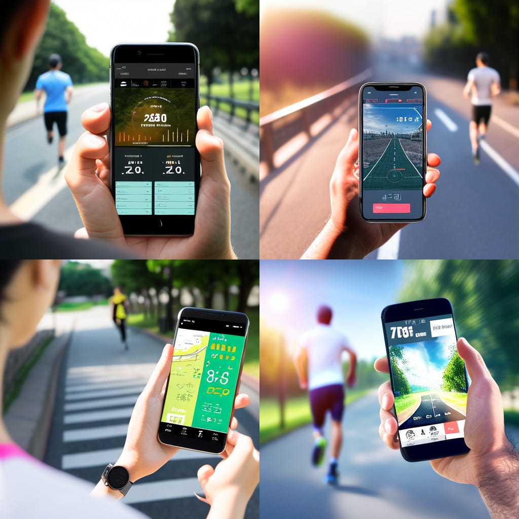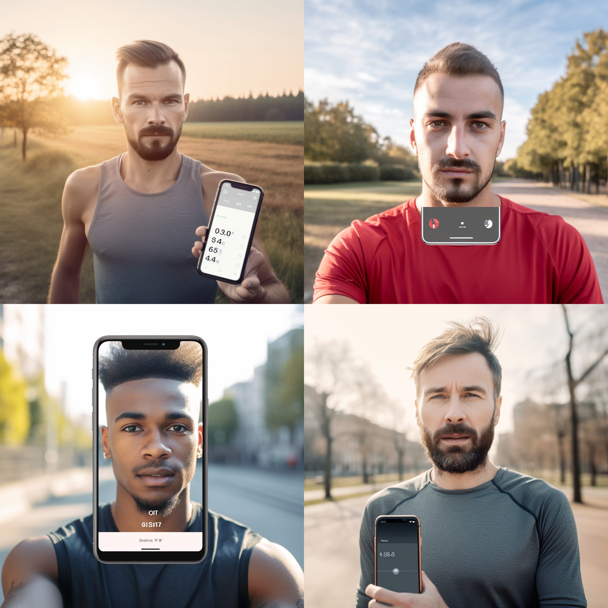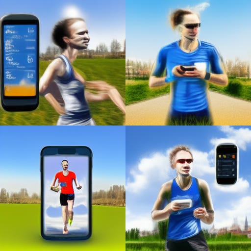 runner holding a smartphone, outdoor setting, ChatGPT app interface visible on screen, content expression on runner's face, bright and clear day, high-resolution